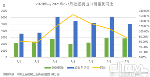 图3:2020年与2021年1-7月挖掘机出口销量及同比
