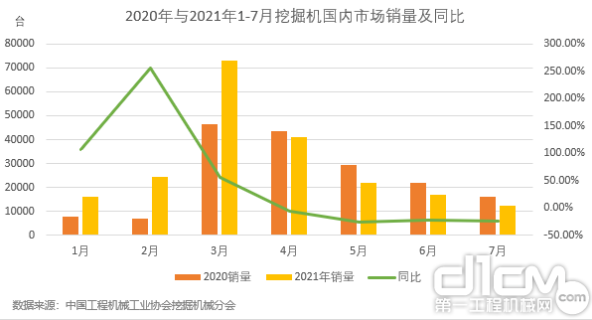 图2:2020年与2021年1-7月挖掘机国内市场销量及同比