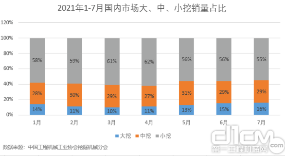 图5: 2021年1-7月国内市场大、中、小挖掘机销量占比