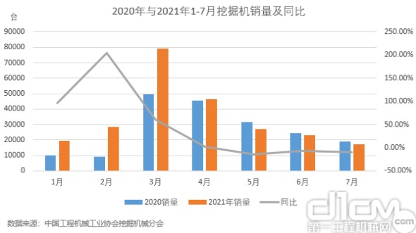 2021年下半年伊始,挖掘机市场依旧延续了二季度销量下滑的趋势。据中国工程机械工业协会行业统计数据,2021年7月,共计销售各类挖掘机械产品17345台,同比下降9.2%,不及市场预期,成为2021年以来销量最低月份。