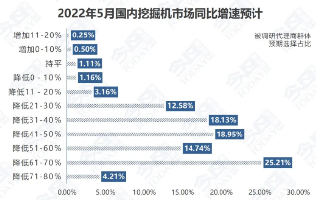 5月,市场如何?来自中国工程机械市场研究中心对2022 年5月国内挖掘机市场的监测结果显示,有44%的被调研代理商预计同比下滑幅度超过50%,其中有25%的代理商认为将依然出现61-70%的高位下滑。