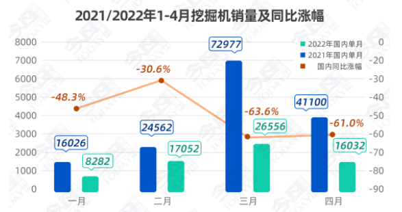 4月,挖掘机国内市场销量16,032台,同比下降61.0%;