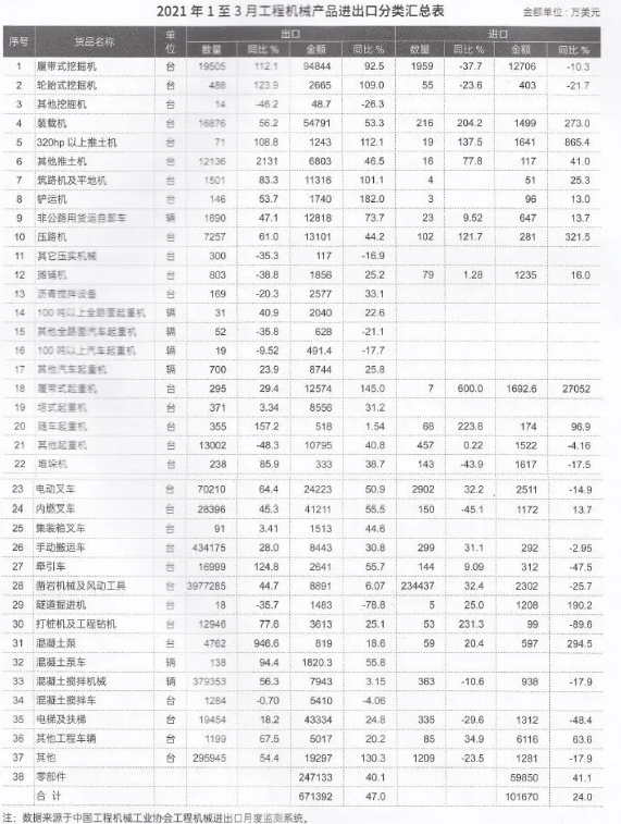 出口方面,累计出口整机42.43亿美元,同比增长51.3%,占出口总额的63.2%;零部件出口24.71亿美元,同比增长40.1%,占出口总额的36.8%。1至3月出口额增加的主要整机有:履带挖掘机、叉车、装载机等。出口额减少的主要有:隧道掘进机等。