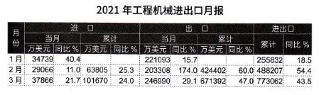 据海关数据整理,2021年1-3月我国工程机械进出口贸易额为77.31亿美元,同比增长43.5%。其中进口金额10.17亿美元,同比增长24%,出口金额67.14亿美元,同比增长47%,贸易顺差56.97亿美元,同比增长19.5亿美元。