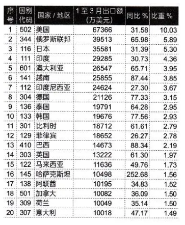 进出口主要区域市场分布及变化看,东蒙回到我国工程机械最大区域市场地位,紧随其后的是:欧盟及英国和非洲拉美,出口额分别为:12.05、11.09和10.94亿美元;美国市场增长31.6%,不及出口总额增幅,占比下降到10.03%。主要出口国别方面,对美、俄、日、印、澳、越、印尼、德等国一季度出口2亿美元以上,继续保持我们工程机械主要市场地位,对其他主要出口目标市场出口情况见下表: