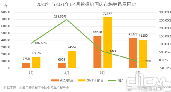 4月挖掘机销量数据出炉。据中国工程机械工业协会行业统计数据,2021年4月,共计销售各类挖掘机械产品46572台,同比涨幅2.5%,虽然不及此前行业咨询机构和媒体“同比增速在10.1%左右”的预期,但整体来看,行业增速与市场发展趋势吻合。