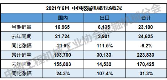 2021年6月销售各类挖掘机23100台,同比下降6.19%;其中国内16965台,同比下降21.9%;出口6135台,同比增长111%。2021年1-6月,共销售挖掘机223833台,同比增长31.3%;其中国内193700台,同比增长24.3%;出口30133台,同比增长107%。