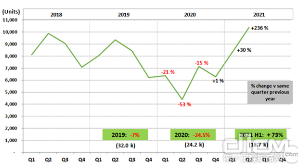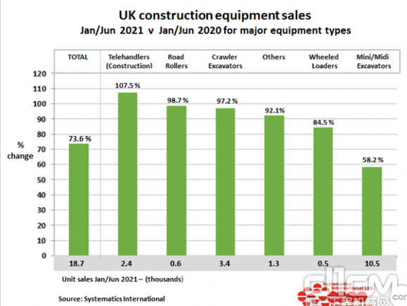 英国工程机械学会(CEA)最新数据显示,2021年上半年英国工程机械设备共计销售18000余台,比2020年同期增长73%,相比疫情前的2018年和2019年同期分别增长4%和7%。其中,6月份建筑和土方机械销量比2020年同期增长75%,使2021年第二季度的设备总销量达到 10000 台左右。
