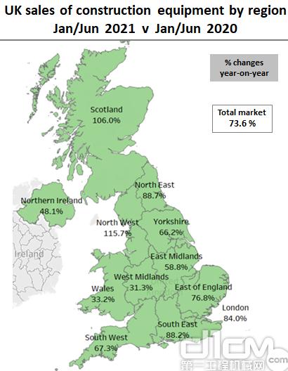 从区域来看,2021年上半年苏格兰和英格兰西北部的设备销量增幅最大,是2020年上半年的两倍之多。西米德兰兹和威尔士的上半年的销量比2020年同期增长30%左右。爱尔兰地区也在统计范围内,2021年上半年设备销量比2020年同期增长56%。