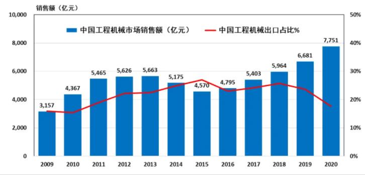 图1:中国工程机械市场销售额和出口占比