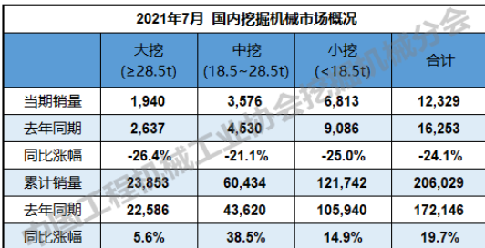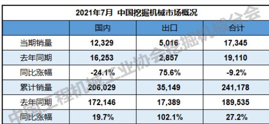 单就7月挖机销量而言,据统计2021年7月,共计销售各类挖掘机械产品17345台,同比下降9.2%。其中,国内市场销量12,329台,同比下降24.1%;出口销量5,016台,同比增长75.6%。