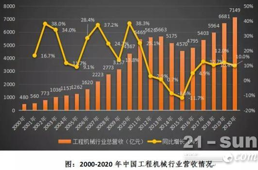 2020年全球工程机械制造商TOP50总销售额达到1972.51亿美元。根据工程机械协会统计数据,经过三十多年的发展,我国工程机械保有量超1000万台,2020年工程机械销售收入突破7000亿,居世界第一位。