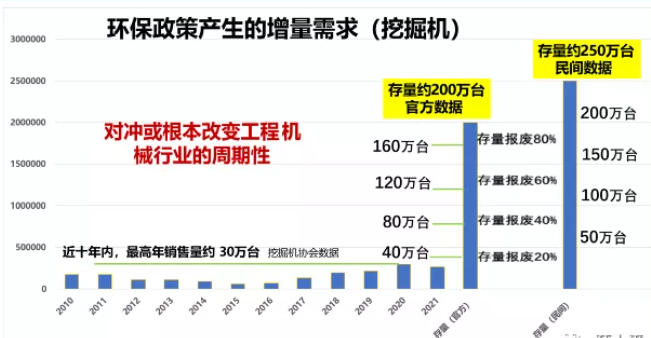 以工程机械最大的存量设备挖掘机为例:官方数据约为200万台套,民间数据为约250万台套,其中涉及环保不达标的设备,每一种类型设备具体究竟有多少,没有见到过详细统计数据,都是不同角度的估计值。究竟有多少环保不达标设备可能需要报废,笔者认为当下也只能是大概百分比的估计值。