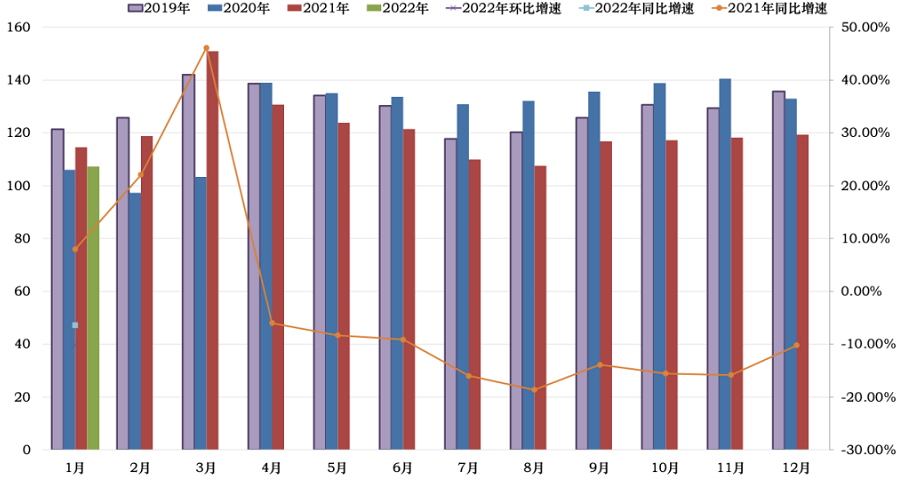 尽管从各地下游终端市场的反馈情况来看,目前投资和项目的落地情况,以及资金到位情况都低于预期。但从国家层面,已经开始在政策和资金层面有所放开,并明确提出,适度超前开展基础设施投资以稳定预期。随着2021年下半年以来加快地方政府专项债券发行节奏,还有中央预算内投资加快下达进度,“十四五”规划确定的102项重点项目陆续启动,“两新一重”项目有序建设,财政货币投资等政策支持力度加大,都有利于固定资产投资稳步恢复。从投资的先行指标看,2021年1-12月份,新开工项目287769个,比1-11月份增加36767个;新开工项目计划总投资比上年增长3.3%,比1-11月份加快0.6个百分点,连续2个月加快。2022年年初以来,各地按规划开工了一批重点项目。