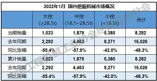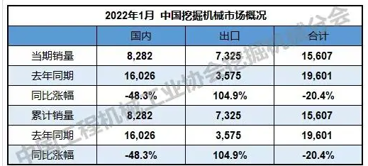 根据中国工程机械工业协会行业统计数据,2022年1月纳入统计的26家主机制造企业,共计销售各类挖掘机械产品15,607台,同比下降20.4%。其中,国内市场销量8,282台,同比下降48.3%;出口销量7,325台,同比增长104.9%。