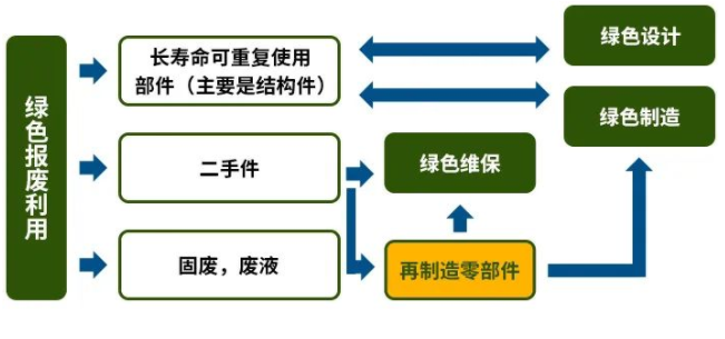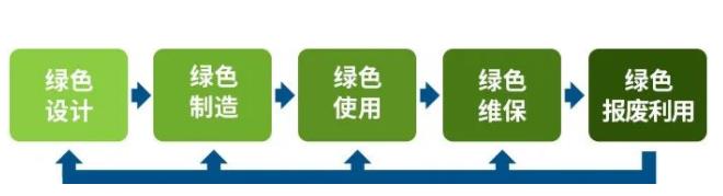 参加下图,具体绿色报废利用、绿色设计、绿色制造和绿色维保等环节是相辅相成的有机整体。