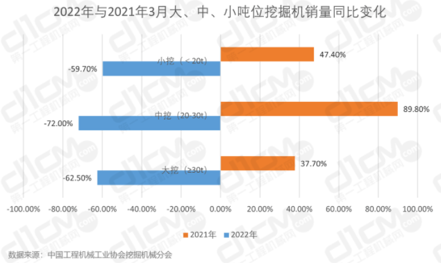 吨位结构方面,3月大挖(≥28.5t)销量2690台,同比下降62.5%;中挖(18.5~28.5t)销量6002台,同比下降72.0%;小挖(<18.5t)销量17864台,同比下降59.7%。大中小挖销量同比增长均为负,其中,中挖同比降幅最大。