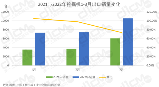 出口市场方面,3月挖掘机出口销量延续高增长态势,达到10529台,同比增长73.5%,成为一年来首次破万的月份。尽管疫情冲击上海、深圳等港口城市,导致物流运输受到一定程度干扰,出口增速有所收窄,但出口市场依然已成为当下挖掘机行业的重要增长点。