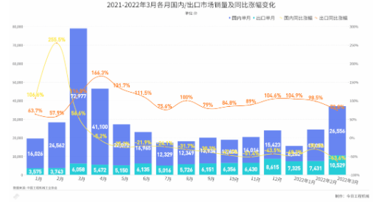 2022年3月,国内市场销量同比下降63.6%,而出口销量则同比增长73.5%。