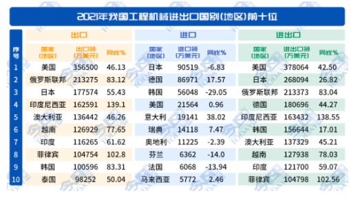 2021年,各主要区域经济体中,我国工程机械出口出现一些新的变化。对韩国出口10.06亿美元,同比增长83.3%;对俄罗斯出口21.33亿美元,同比增长83.1%;对非洲拉美出口58.57亿美元,同比增长78.6%;对欧盟出口51.52亿美元,同比增长69.5%;对东盟出口63.4亿美元,同比增长68.6%。上述地区在主要目标市场中增幅较大,超过总体出口增幅。对美国出口35.65亿美元,同比增长46.1%;对香港出口3.91亿美元,同比增长41%;对日本出口17.76亿美元,同比增长55.4%,这几个地区增幅小于总出口额增幅。