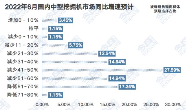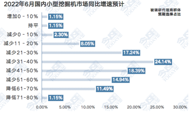 有97.70%的被调研代理商预计2022年6月国内小型挖掘机市场同比出现不同程度的下滑,比5月同期预期基本持平。有27.58%的被调研代理商预计同比下滑幅度超过50%,有18.39%的被调研代理商预计同比下滑41%-50%,有41.38%的被调研代理商预计同比下滑21%-40%,有10.35%的被调研代理商预计同比下滑0%-20%。各有1.15%的被调研代理商预计同比持平或同比小幅增长。