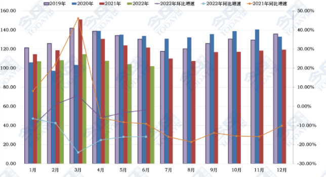 从市场终端的情况来看,2022年6月前三周国内流通领域市场监测挖掘机开工小时数同比降低18.36%,环比降低2.50%。