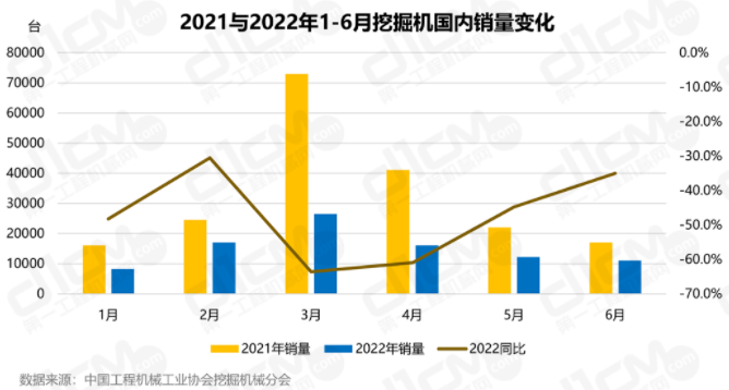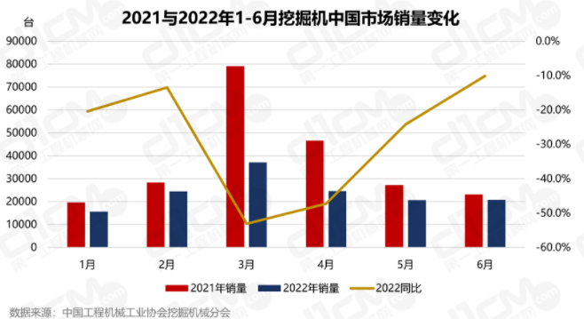 2022年1-6月,国内市场挖掘机销量为91124台,同比下降52.9%。其中,第一季度销售51890台,同比下降54.3%;第二季度销售39238台,同比下降51.0%。