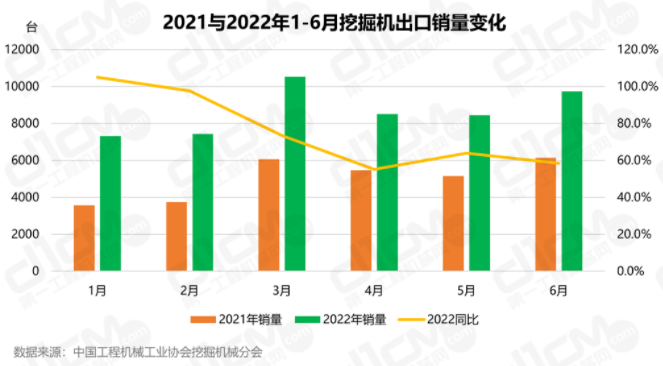 4月,我国经济新的下行压力加大,致使挖掘机销量依旧深度下跌,同比降幅仍超过60.0%。5月,在各地区各部门高效统筹疫情防控和经济社会发展的努力下,产业链供应链逐步疏通,企业开工率和产能利用率不断提升,当月国内挖掘机销量跌幅收窄(-44.8%)。6月,多项与工程机械相关的稳经济一揽子政策有效实施,基建项目持续落地,对国内挖掘机销量产生了积极影响,该月国内挖掘机销量企稳回升(-35.0%)。