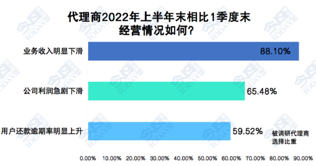 对比2022年第1季度,2022年上半年有88.10%的被调研代理商的业务明显下滑,各有65.48%和59.52%的代理商的利润急剧下滑和用户还款逾期率明显上升。