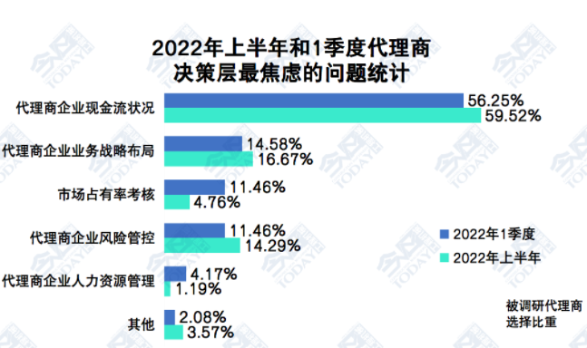 从代理商决策层最焦虑的核心问题看,分别有企业现金流状况、企业业务战略布局、风险管控和市场占有率考核是代理企业目前阶段承压最大的四个层面。
