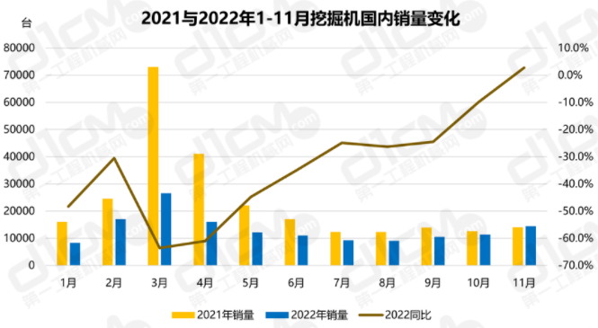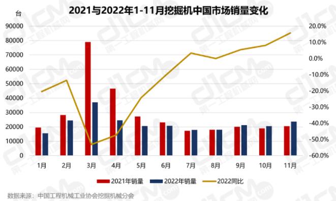 据中国工程机械工业协会行业统计数据,2022年11月,共计销售各类挖掘机械产品23680台,同比增长15.80%,销量增速连续4个月保持正增长,成为2022年1-11月同比增速最高月份。