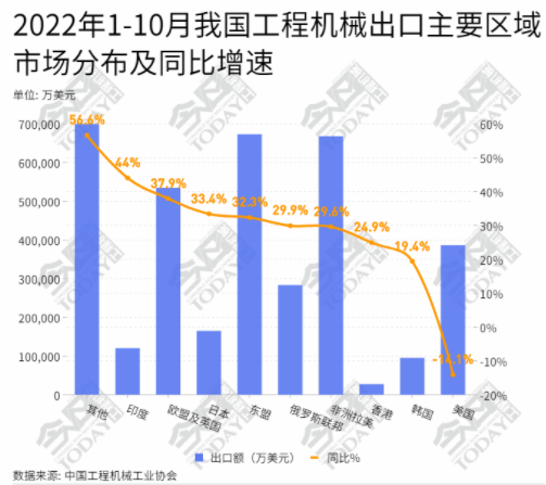 2022年1-10月,我国工程机械向“一带一路”沿线国家出口合计153.93亿美元,占全部出口的42.1%,同比增长32.1%。向金砖国家出口59.2亿美元,占全部出口额的16.2%,同比增长55.6%。