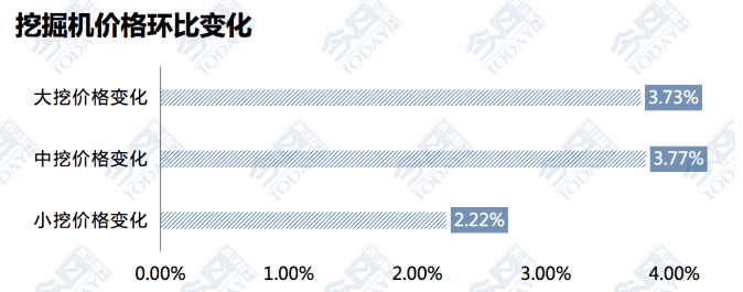 2023年3月上旬,国内市场,大挖销售成交价格环比2月初上涨3.73%;中挖销售成交价格环比2月初上涨3.77%;小挖销售成交价格环比上涨2.22%。