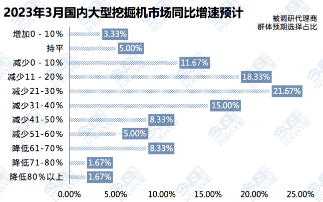 有91.67%的代理商预计2023年3月国内大挖市场同比出现不同程度的下滑。有16.67%、8.33%、15.00%、21.67%和30.00%的代理商预计同比下滑幅度超过50%、下滑41%-50%、下滑31%-40%、下滑21%-30%和下滑0%-20%。