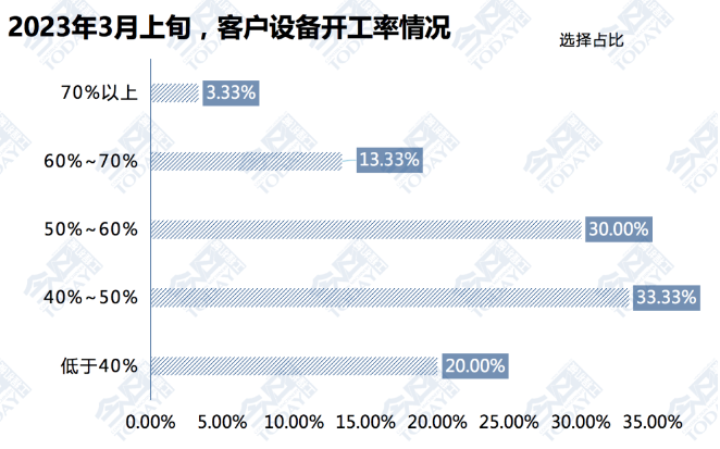 2023年3月上旬,有20.00%的被调研客户的设备开工率低于40%,比2月底改善了6.67个百分点;16.66%的被调研客户的设备开工率超过60%;50%~60%开工率的客户比重为30.00%;40%~50%开工率的客户比重为33.33%。