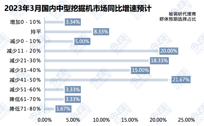 有88.33%的代理商预计2023年3月国内中挖市场同比出现不同程度的下滑。有8.33%、21.67%、15.00%、18.33%和25.00%的代理商预计同比下滑幅度超过50%、下滑41%-50%、下滑31%-40%、下滑21%-30%和下滑0%-20%。