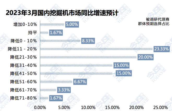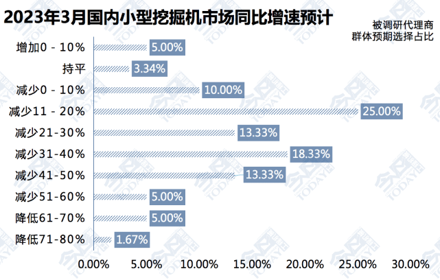 有91.66%的代理商预计3月国内小挖市场同比出现不同程度的下滑,比2月同期预期占比增加24.99个百分点。有11.67%、13.33%、18.33%、13.33%和35.00%的代理商预计同比下滑幅度超过50%、下滑41%-50%、下滑31%-40%、下滑21%-30%和下滑0%-20%。