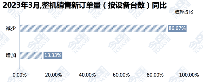 有86.67%的代理商预计2023年3月整机销售新订单量同比会减少,减少幅度比上月恶化23.51个百分点,有13.33%的代理商预计整机新订单量会同比增加。