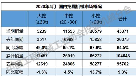 2020年4月,共计销售各类挖掘机械产品45426台,同比涨幅59.9%。国内市场销量43371台,同比涨幅64.5%。出口销量2055台,同比涨幅0.9%。