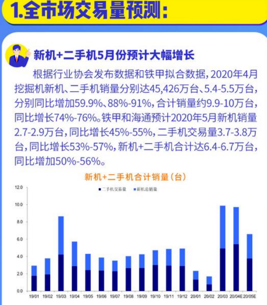 铁甲和海通预计2020年5月新机销量2.7-2.9万台,同比增长45%-55%,二手机交易量3.7-3.8万台,同比增长53%-57%,新机+二手机合计达6.4-6.7万台,同比增加50%-56%。